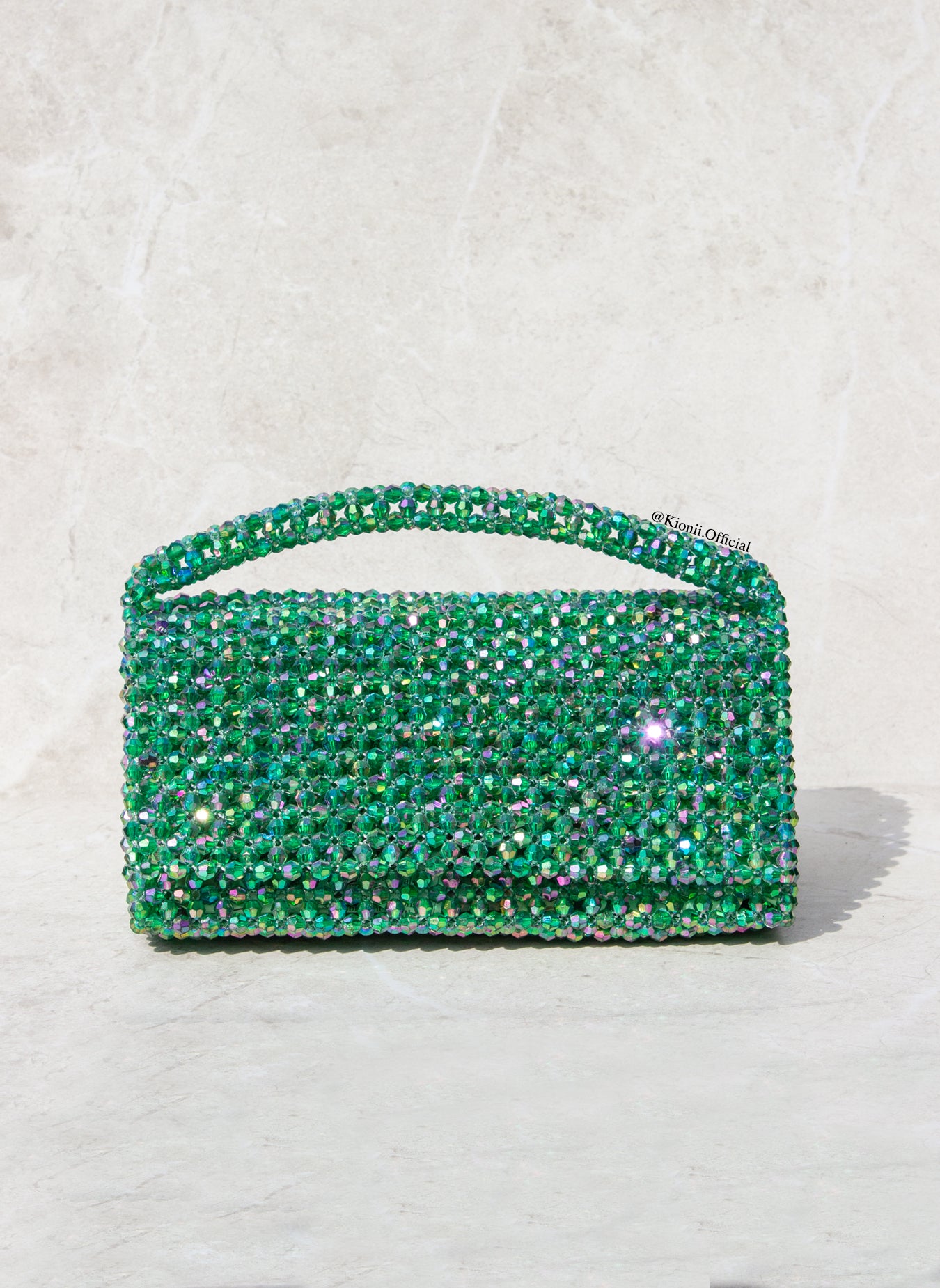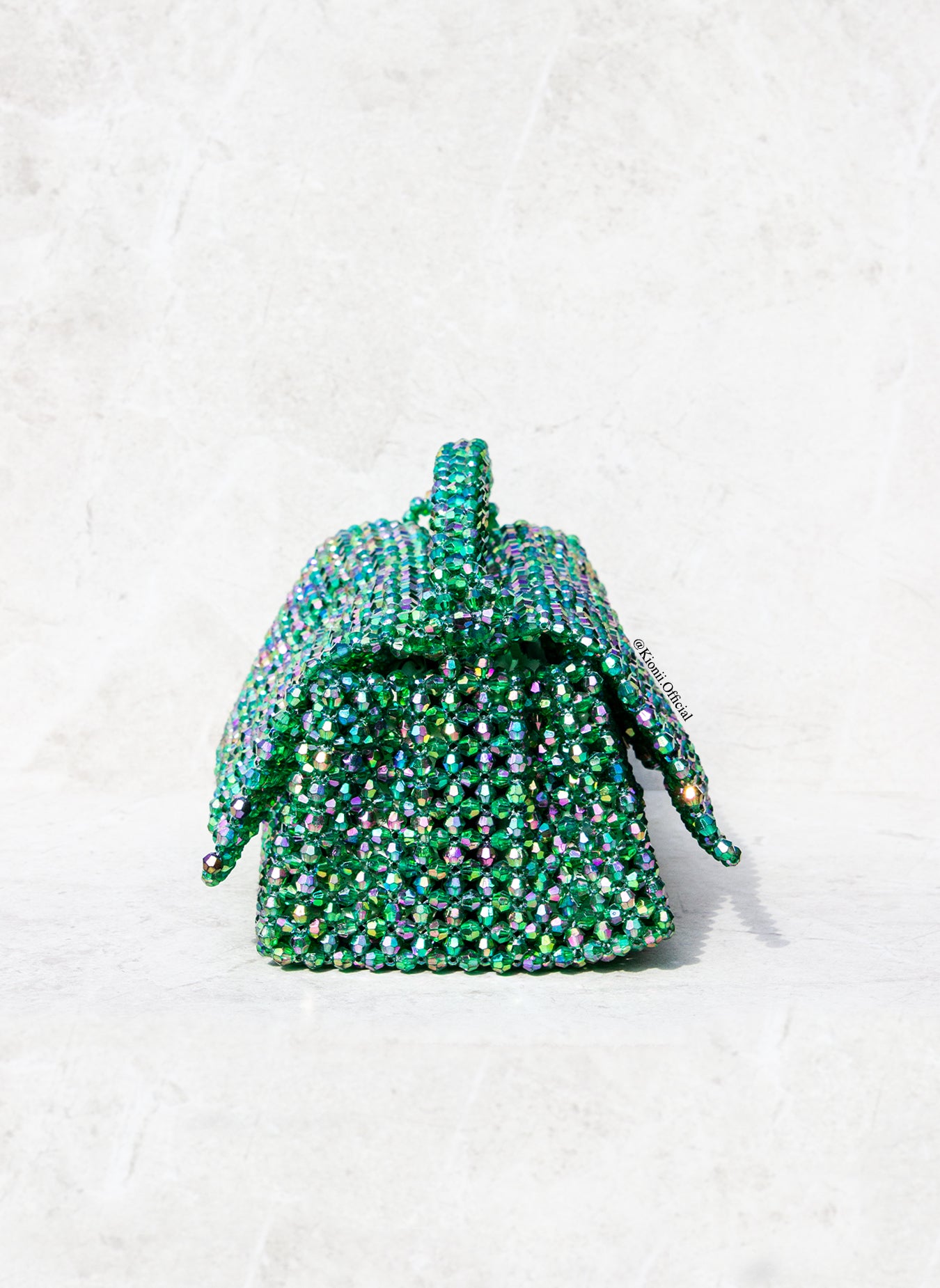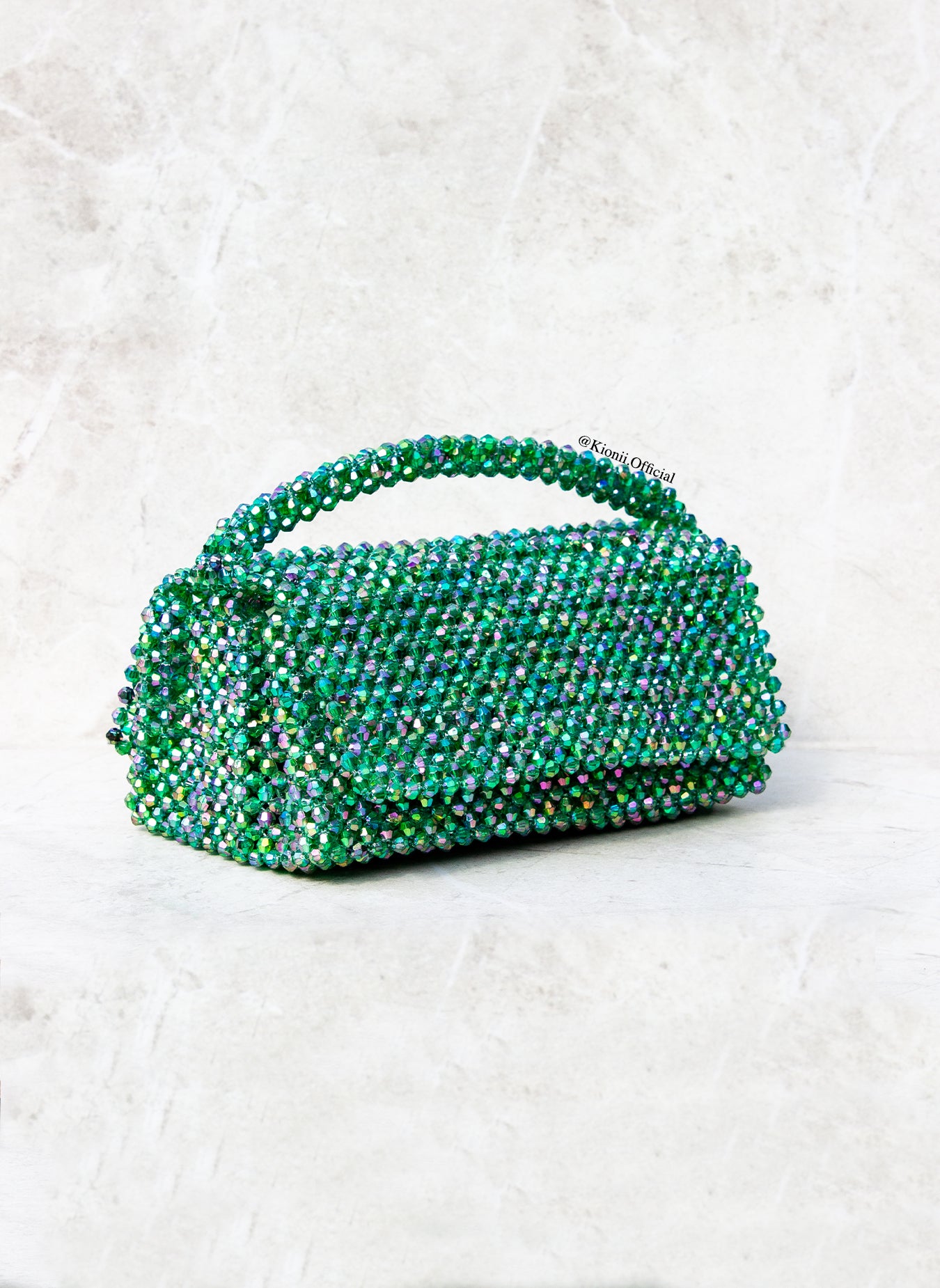 Dazzle at every event with this stunning handmade beaded bag, meticulously crafted from sparkling emerald-green crystals. The intricate beading gives the bag a luxurious shimmer, ensuring all eyes are on you. Whether you’re heading to a party, wedding, or a night out, this chic accessory adds a touch of glamour to any outfit.