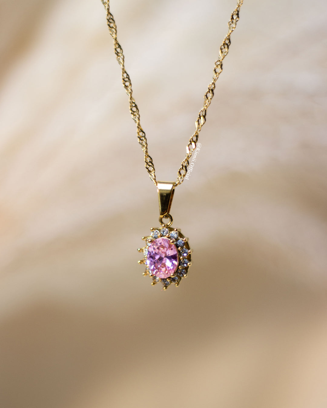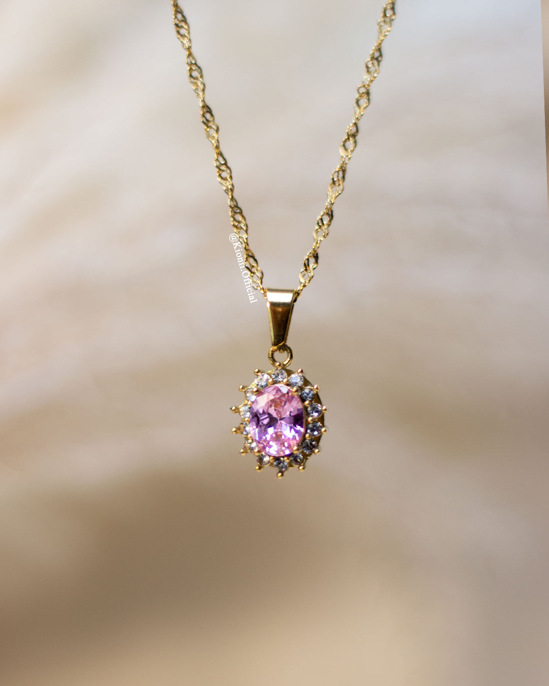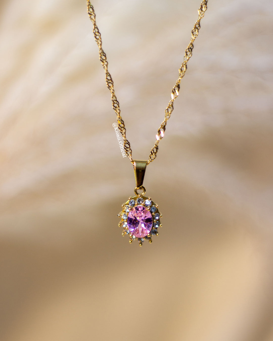 The Lala Tourmaline pendant is a gold-plated pendant that is set with a beautiful pink stone for the October month. The pendant is an oval shape and is approximately 25mm x 15mm. The pendant is perfect for those looking for a light pink stone that will draw attention.