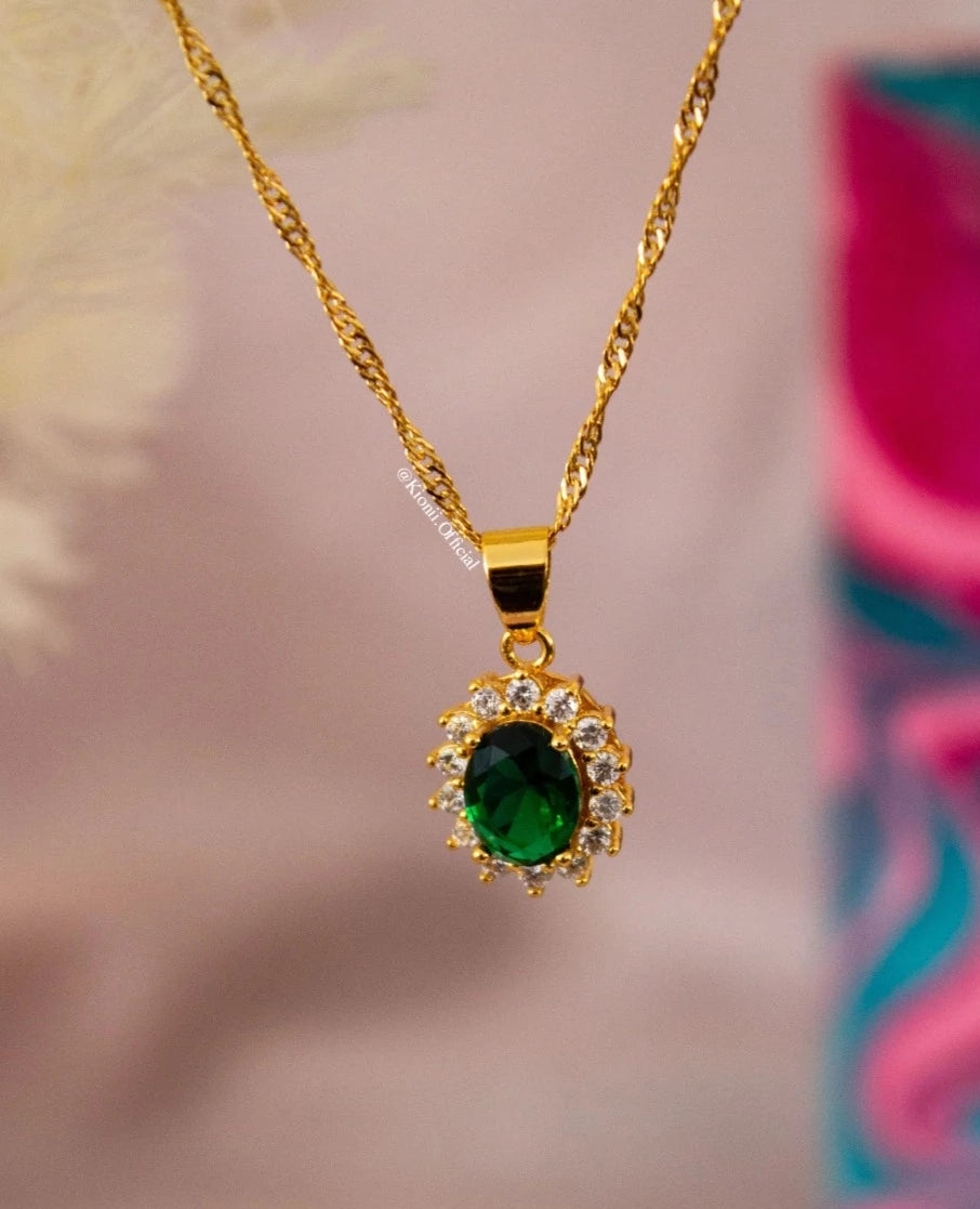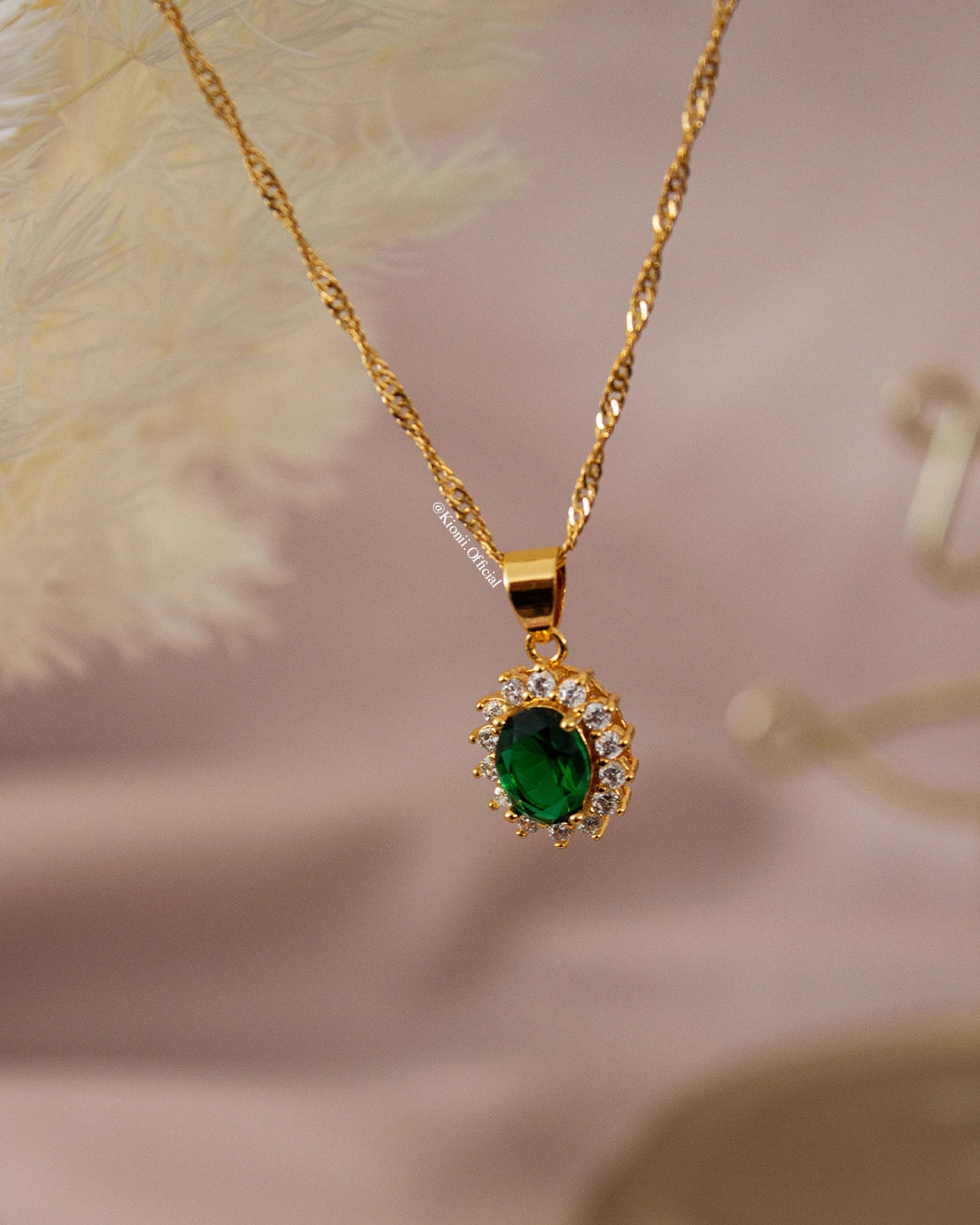 The Lala Emerald pendant is a gold-plated pendant that is set with a beautiful green emerald stone. The pendant is an oval shape and is approximately 25mm x 15mm. The pendant is perfect for those looking for a deep green stone that will draw attention.