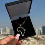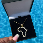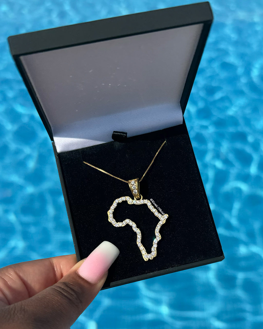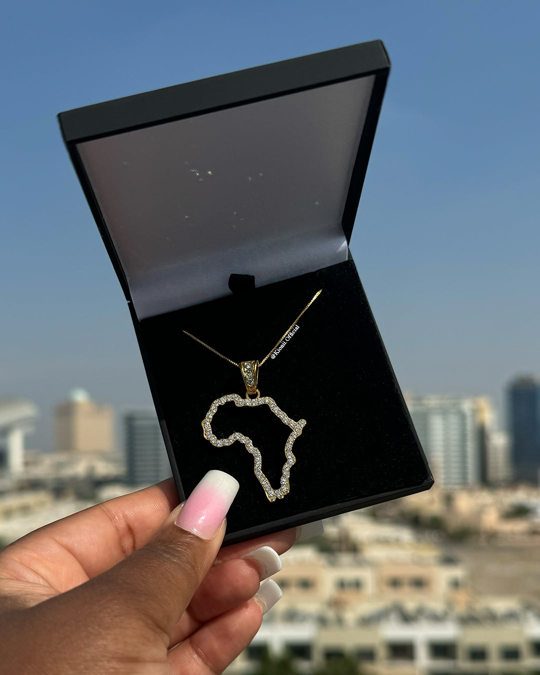Elegance meets craftsmanship in our stunning Shuri Africa Outline Necklace! 💎 Handcrafted with precision and adorned with sparkling cubic zirconia crystals, it's a true statement piece. ✨ Hangs from a double gold-plated box chain for that extra touch of luxury. 💖 Elevate your Kionii collection with this beauty!