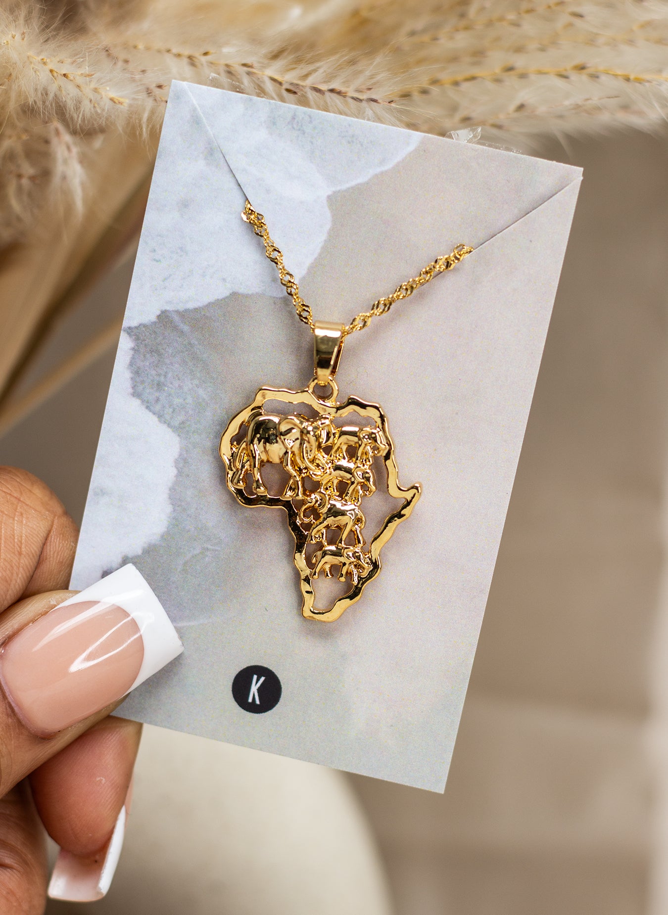 Bold, radiant, and full of heritage - the Golden Safari Africa Necklace captures the beauty and spirit of the Motherland. Crafted in lustrous gold plating 💛, this statement piece features the outline of Africa adorned with intricate elephant motifs 🐘, symbolising strength, wisdom, and unity.