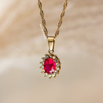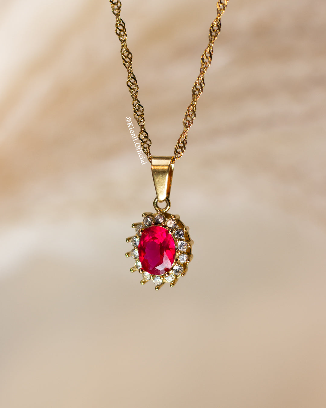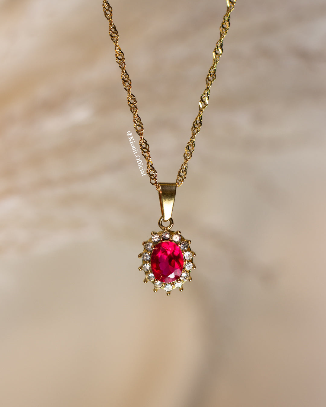 The Lala Ruby pendant is a gold-plated pendant that is set with a beautiful ruby cherry red stone for July month. The pendant is an oval shape and is approximately 25mm x 15mm. The pendant is perfect for those looking for a cherry red crystal stone that will draw attention.